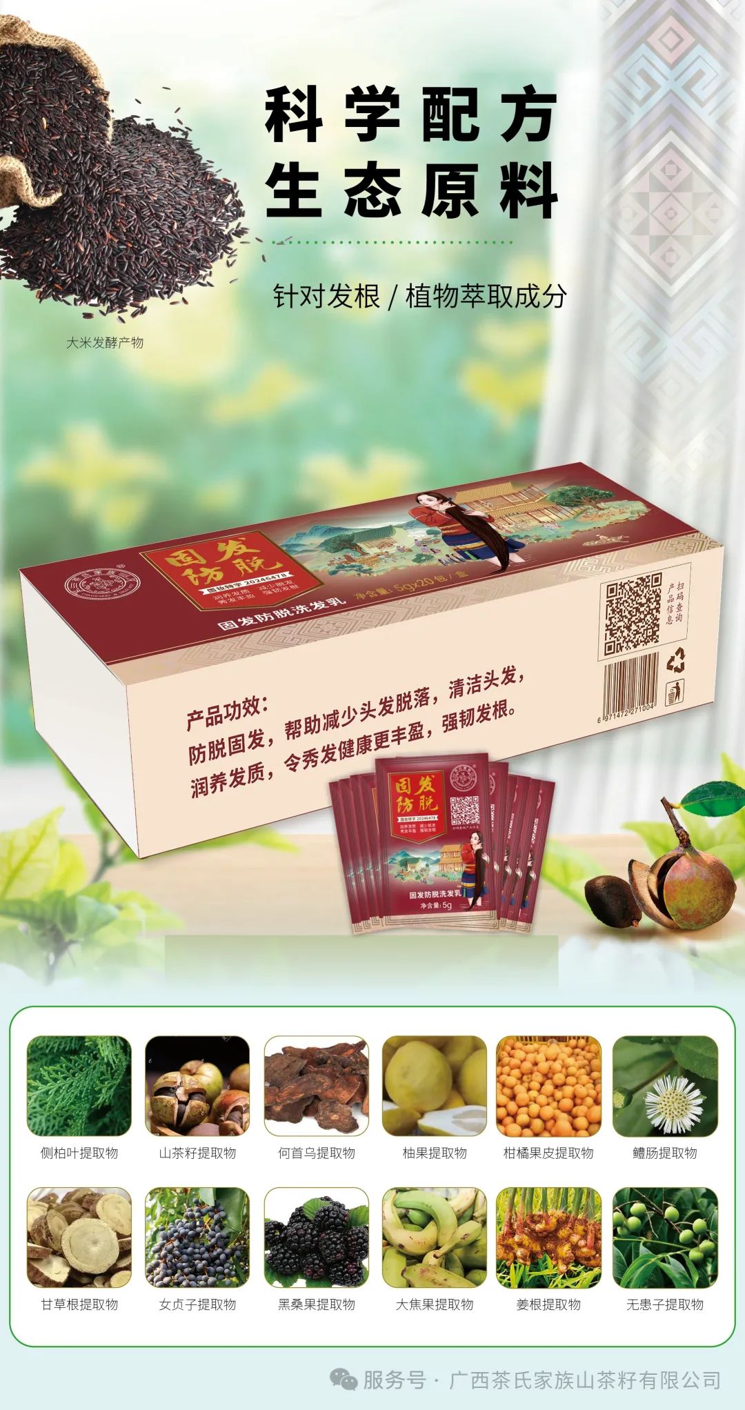 1:生产工艺:用茶麸(巴马所略乡3万亩有机油茶籽采集基地)和防脱固发中药(人参(长白山人参)、侧柏叶、何首乌、墨旱莲、女贞子、云南小黄姜、黑桑果、皂角、无患子(洗手果)等)再加水果(柚子、柑子/橘子、香蕉等)再加乳酸菌/大米发酵产物(淘米水酵素)、稻米发酵产物滤液(米酒)、红糖等经过≥365天发酵而成