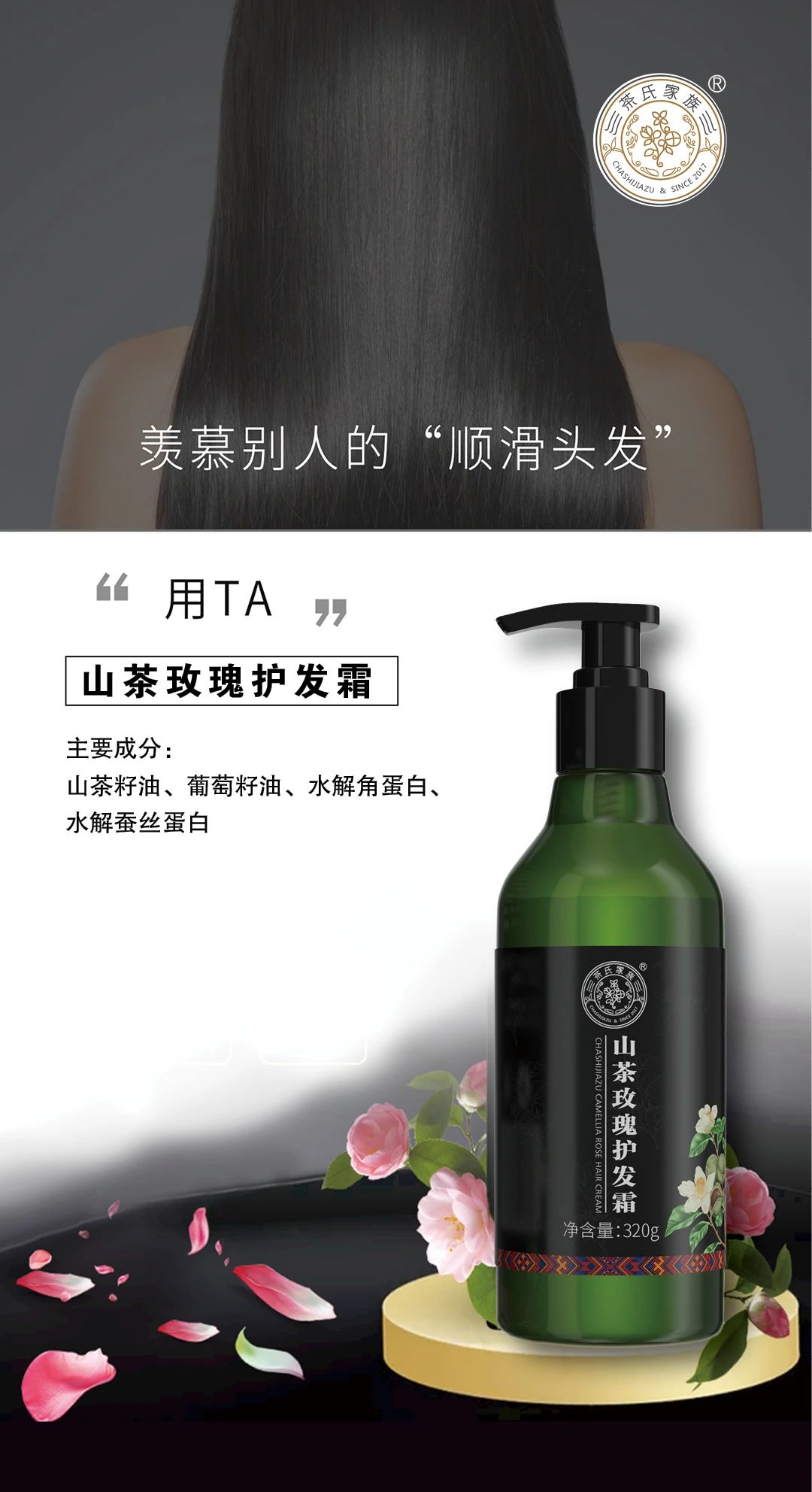 茶氏家族山茶玫瑰护发霜抚平发丝躁点,避免干枯,给予秀发细致呵护。