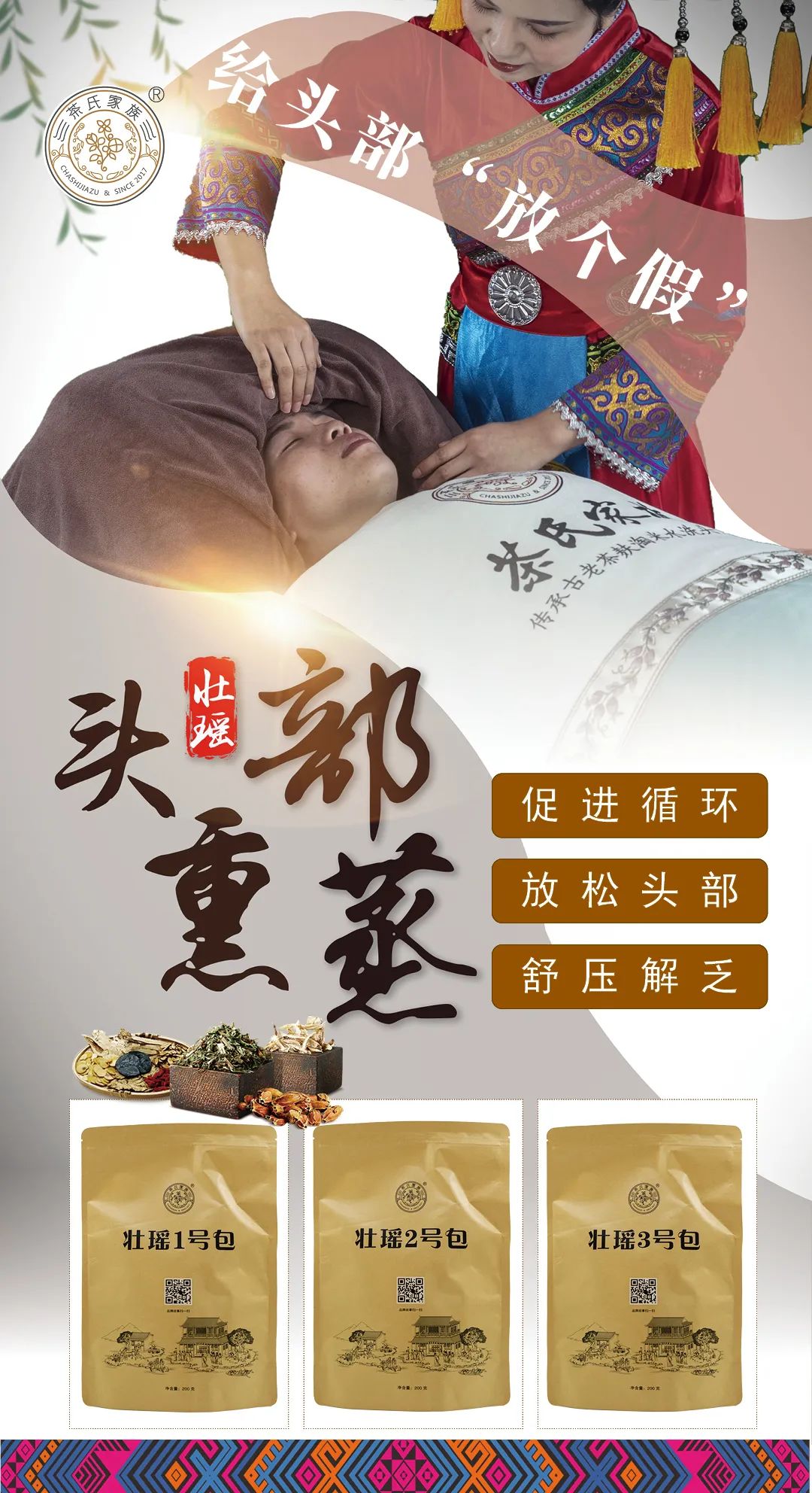 茶氏家族壮瑶头部熏蒸传承传统中医养生手法和广西瑶药的文化精髓,沿袭瑶族民间养发秘方,汲取瑶族原草精粹,经过古法熬制,独家首创,制成了壮瑶熏蒸三道汤。