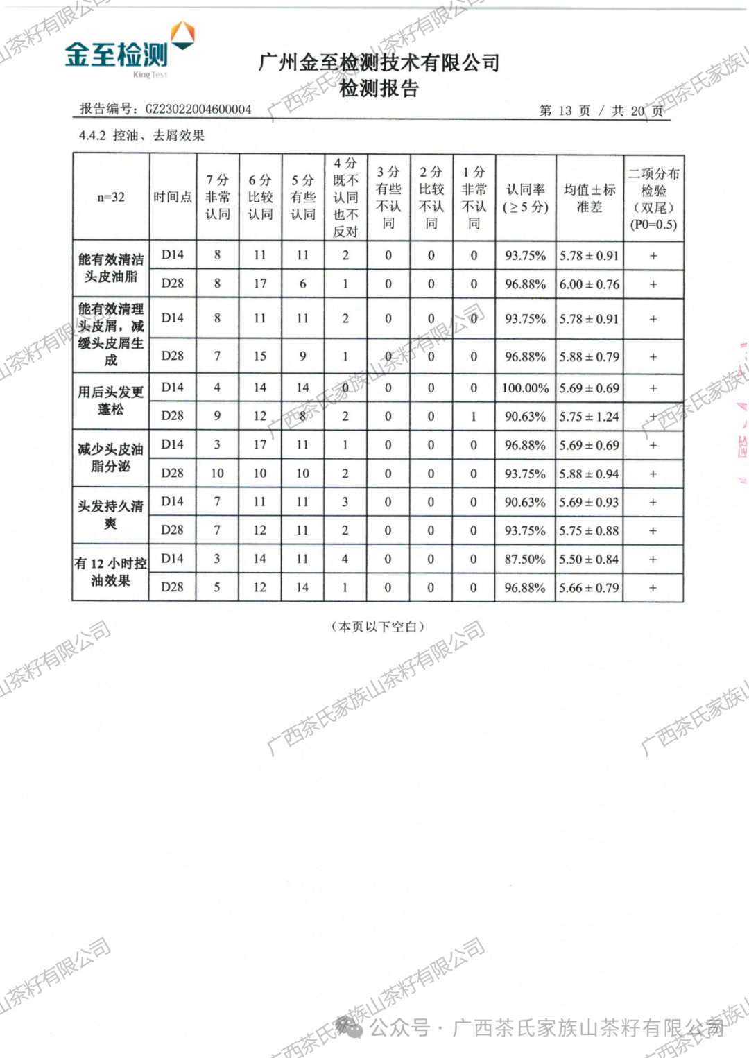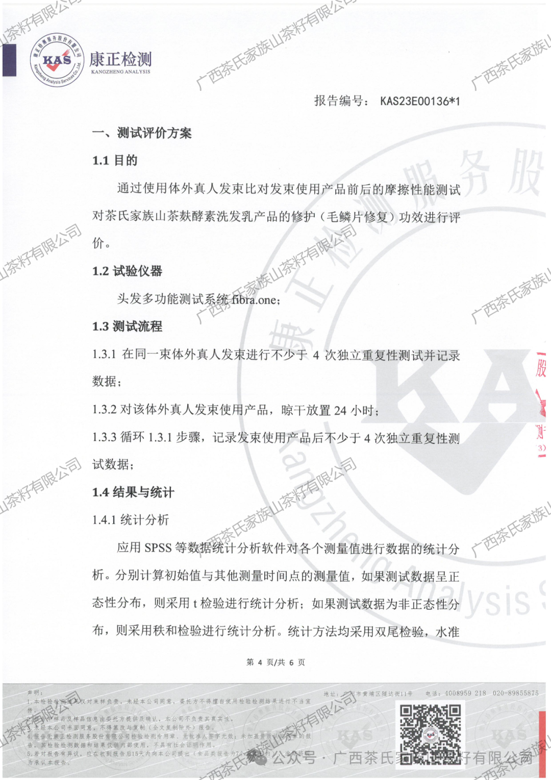 功效评价检测结果:使用由广西茶氏家族山茶籽有限公司提供的茶氏家族山茶麸酵素洗发乳能有助于修复毛鳞片,使头发毛鳞片保持正常状态,减少摩擦性能的效果。