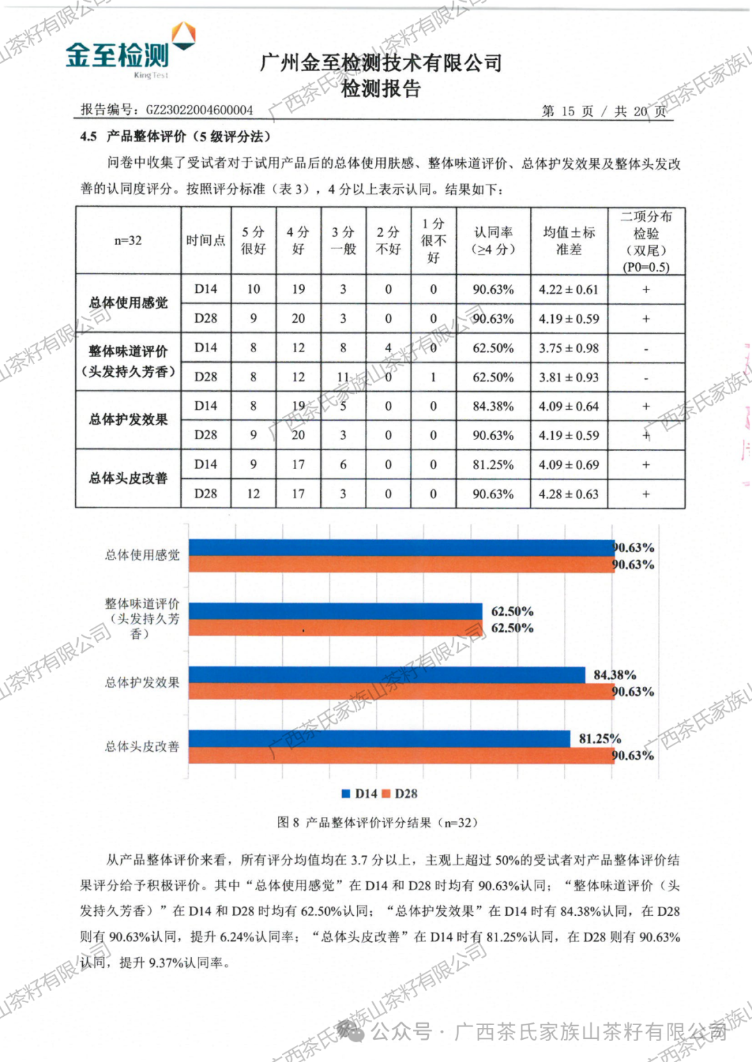 功效评价检测结果:使用该产品28天后,受试者对产品质地气味观感、肤感、温和度、保湿、舒缓、防断发、控油和去屑效果及最终使用感受分别进行了评分,统计学上超过50%的受试者对产品的各项评分给予了积极评价。